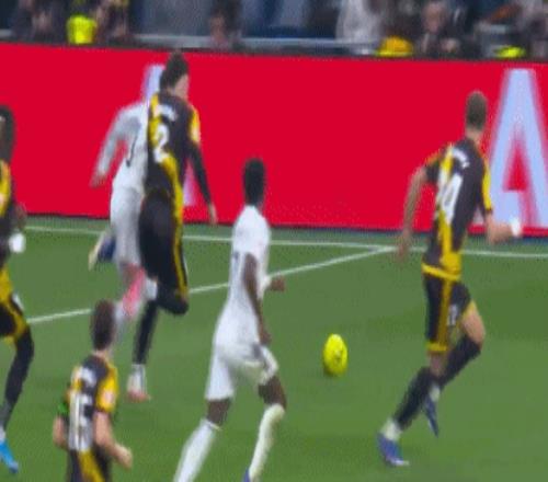 第15分钟,卜拉欣-迪亚斯分球左路,威尼修斯施展个人能力,禁区内变向摆脱一气呵成,随后一脚兜射直挂死角,皇马打破僵局,1-0!