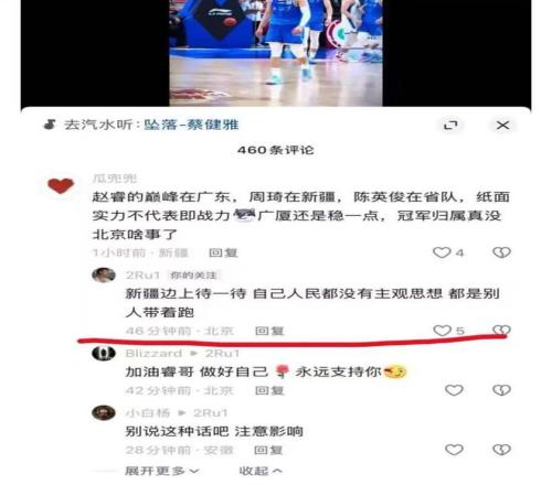 真正引发风波的并非赛场上的失误,而是赛后在社交媒体上的互动,一位新疆球迷留言评价道:“赵睿的巅峰在广东,周琦在新疆,陈盈骏在省队,纸面实力不代表即战力,广厦还是稳一点,冠军归属真没北京啥事了。”,这句话似乎触动了赵睿敏感的神经,他的回复不仅涉及篮球讨论,更上升到对新疆人民的主观评价:“新疆边上待一待,自己人民都没有主观思想,都是别人带着跑。”